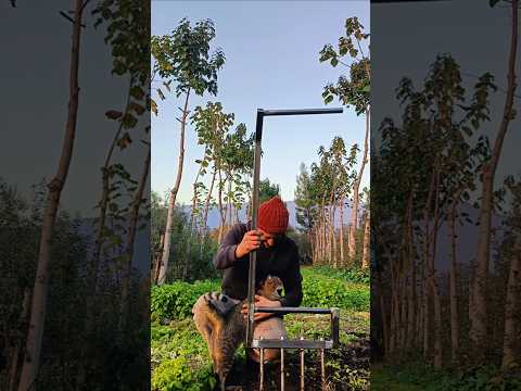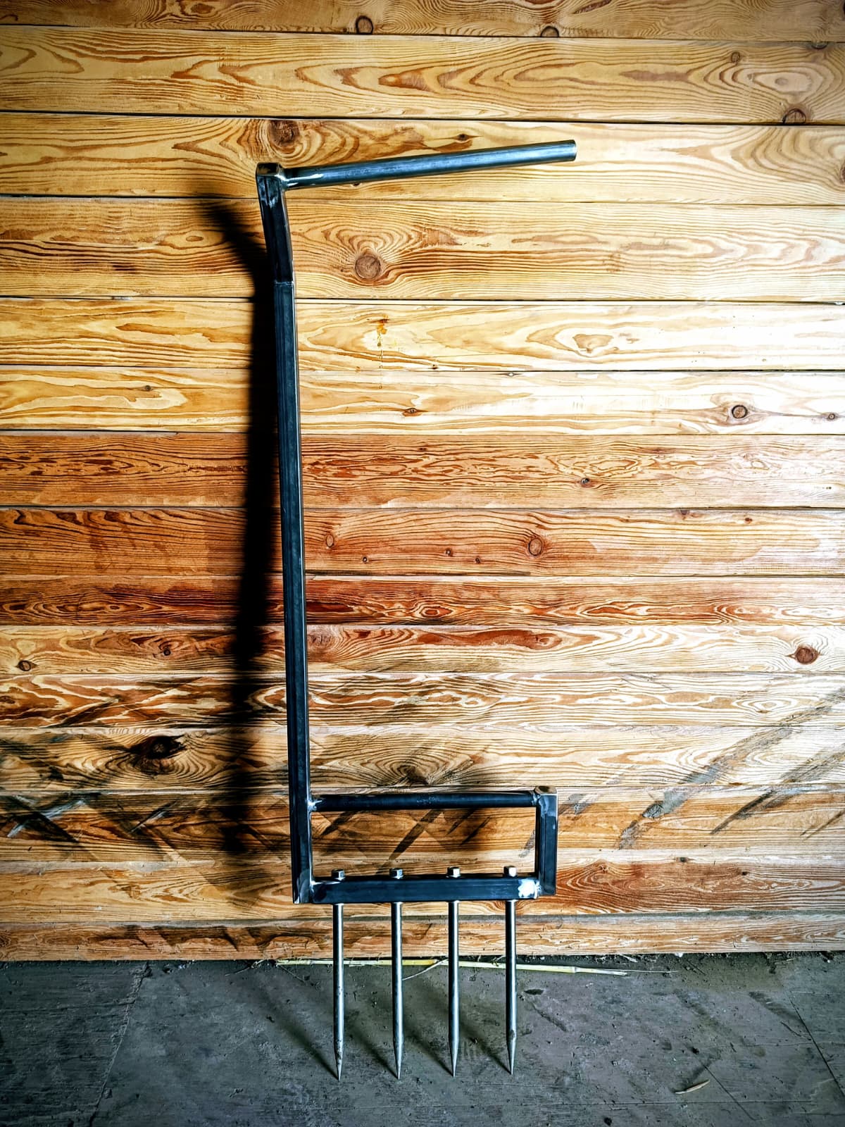 Manico lungo con doppia inclinazione in modo da poter utilizzare la bioforca camminando lateralmemte al camminamemto o letto in fase di lavorazione